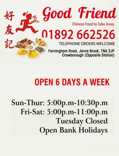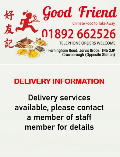 Good Friend @Crowborough Chinese Takeaway serves variety of delicious Chinese dishes. We’re passionate about delivering hot, great tasting, freshly prepared Chinese food to our customers